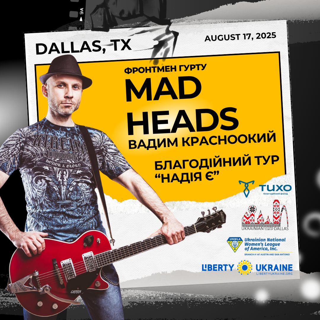 The Ukrainian Cultural Club of Dallas and the “Tykho” Foundation with UNWLA branch 147 and Liberty Ukraine foundation are honored to present an unforgettable evening of music and solidarity with Vadym Krasnookyi, the legendary frontman of the iconic Ukrainian rock band, MAD HEADS.