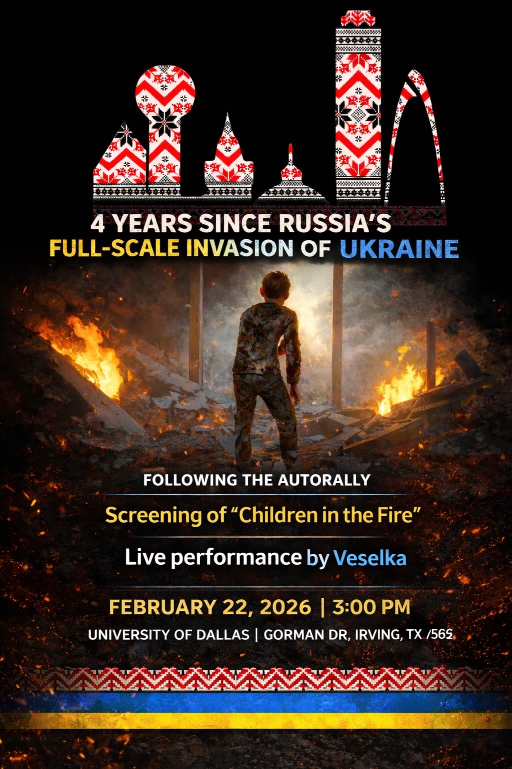 On February 22, 2026, we invite you to join us at the University of Dallas for a powerful day of remembrance, solidarity, and culture as we mark 4 years since Russia’s full-scale invasion of Ukraine.